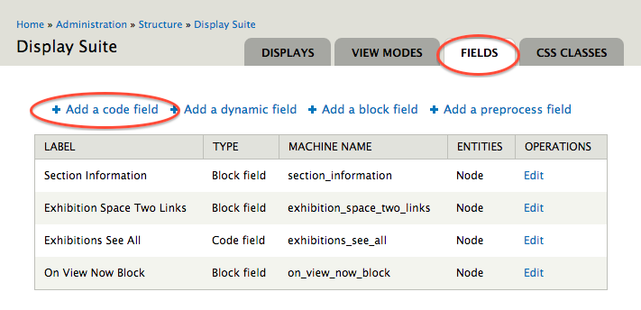 In order for you to access the new code field, you'll need to enable Display Suite for your content type. To do this, you'll need to select a default layout.