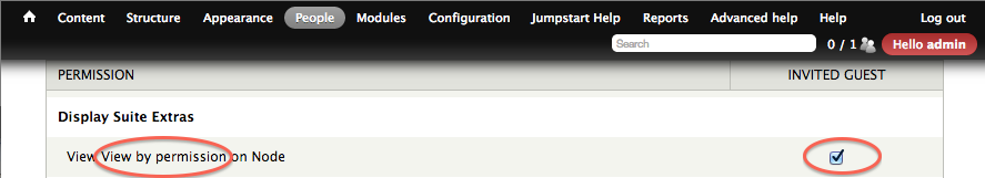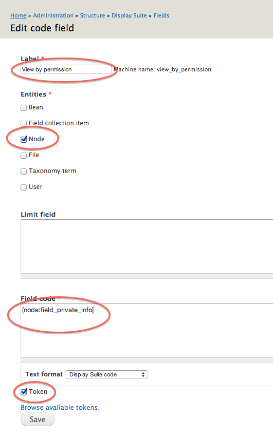 In this post we'll show you an example of how to use Display Suite to display a field which is only visible for specific roles. In this example we use the Display Suite Field permissions, and create 1) an editable field called Private Info and 2) a code field called View by permission. A code field allows you to display among other things, one or more fields. Private Info is the field you enter the information you want hidden for selected roles, and View by permission displays the information in Private Info according to role permissions. Once View by permission has been created and Display Suite has been enabled for your content type, the code field will appear on the Manage Display page on the content type edit form; you won't see it on the Manage Fields form. You can set who can see the View by permission field on the Permissions page at admin/people/permissions.