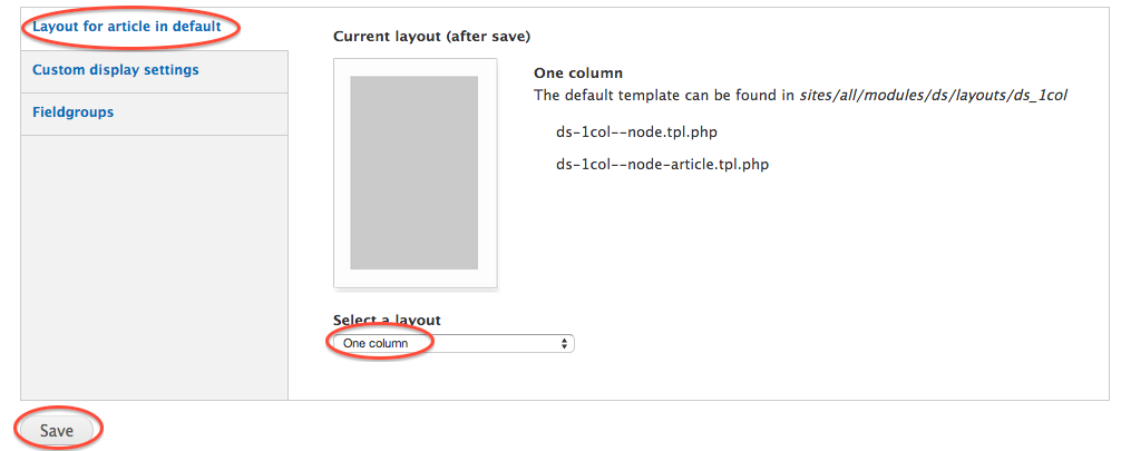 2. In the vertical tabs at the bottom of the form select Layout for your content type in default