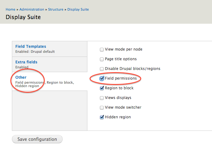 3. On Extras page, select the Other tab, check Field Permissions, and click on Save Configuration