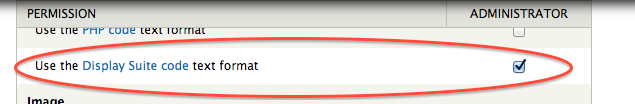 4. On the Permissions page (admin/people/permissions), enable the Use the Display Suite code text format for your role