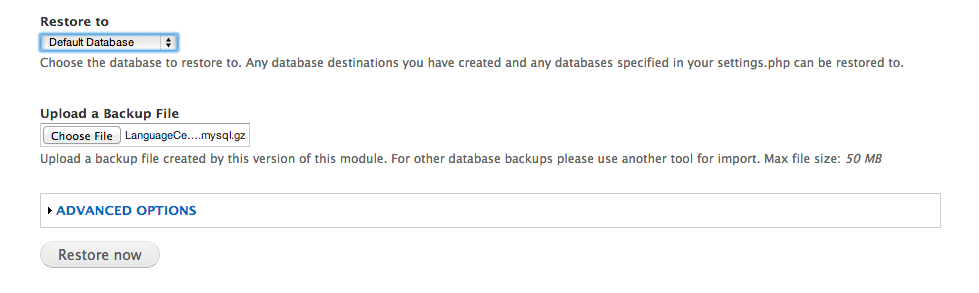 - Again, navigate to Backup and Migrate at Configuration > System > Backup and Migrate (admin/config/system/backup_migrate)